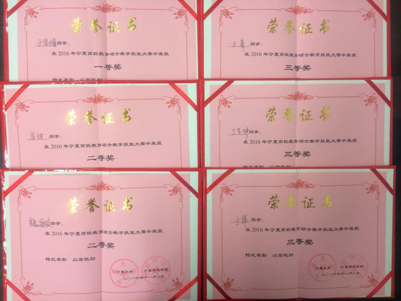 宁夏高校教育硕士教学技能大赛分别从课堂教学、教案、课件三个方面进行评比,评委由中学一线优秀教师和高校专家组成,结构合理,层次多元。经过选手们激烈的角逐和评委老师们的公正评审,教育公司在此次大赛中获得一等奖1名(16级研究生于佳楠),二等奖2名(15级魏海娇, 16级谷甜),三等奖3名(16级丁艺坤、兰菁、于洋),获奖数量和质量占全区所有参赛选手的三分之一强。高志军教授荣获优秀指导教师奖。