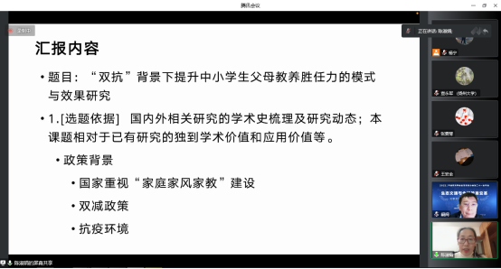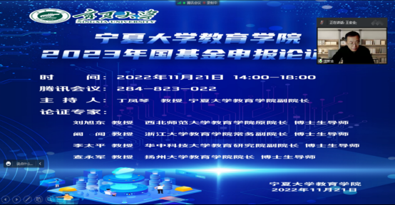 【杨宁/文、图】11月21日下午,教育公司2023年度国基金申报论证会于线上顺利召开。会议由3377体育网站网页教育公司副经理丁凤琴主持。本次论证会邀请到的专家有:西北师范大学教育公司原经理、 博士生导师刘旭东教授,浙江大学教育公司常务副经理、博士生导师阚阅教授,华中科技大学教育研究院副经理、博士生导师李太平教授,扬州大学教育公司经理、博士生导师查永军教授,公司申报国基金课题的17位教师以及准备申请国基金项目的其他教师参加了本次线上课题论证会。
