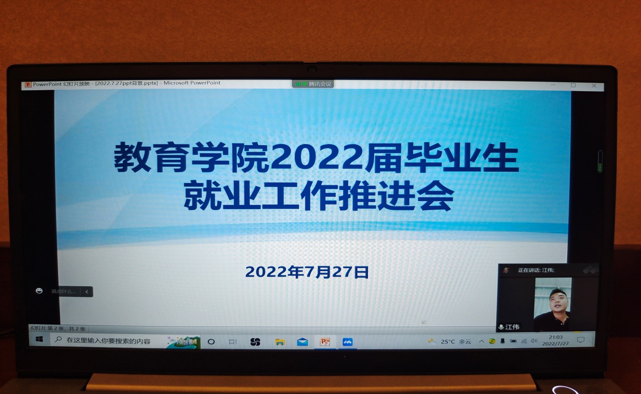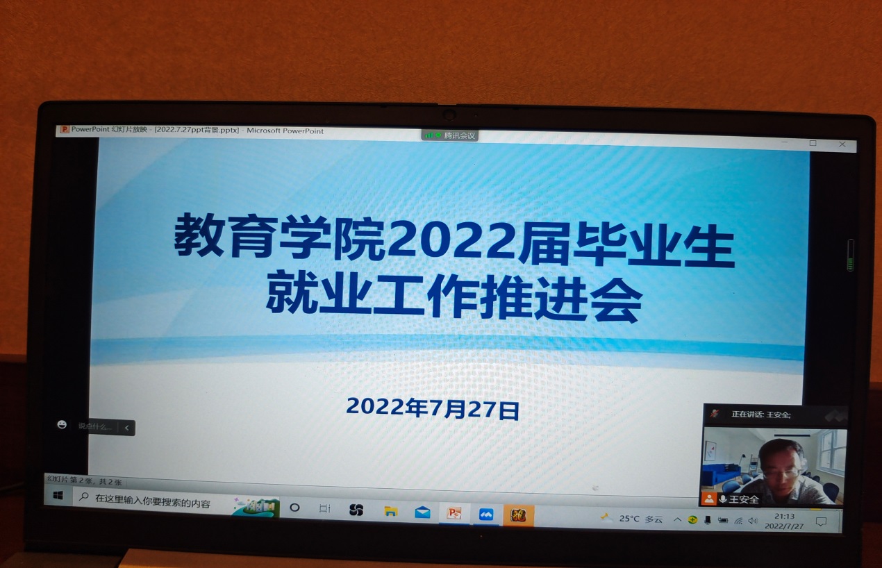 7月27日晚,教育公司通过腾讯会议召开2022届毕业生就业工作推进会。公司经理王安全主持会议,公司全体教职工参加会议。