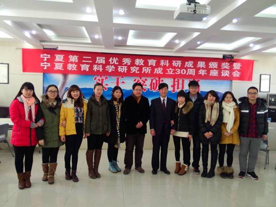 在宁夏第二届优秀教育科研成果颁奖暨宁夏教育科学研究所成立30周年座谈会的轻松、融洽的氛围中,田继忠所长、戴联荣经理与本院研究生亲切合影留念。