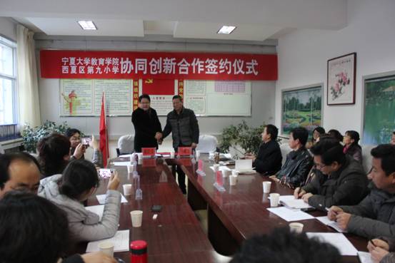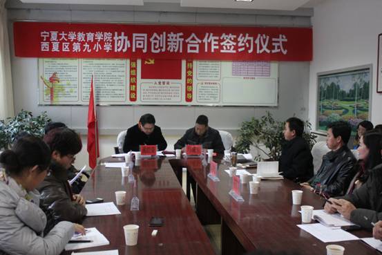 2014年12月11日上午,3377体育网站网页教育公司与银川市西夏区第九小学的协同创新合作签约仪式在西夏区第九小学会议室举行。3377体育网站网页教育公司经理戴联荣、党委副书记张翼、副经理王安全、教育学系主任郝振君及教育系部分教师,西夏区九小董事长马成玉及部分教师、西夏区教育局副局长涂焕应、教研室主任扈国忠、教研员杨馨凤等20多位老师参加了签约仪式。